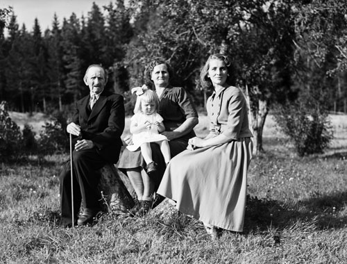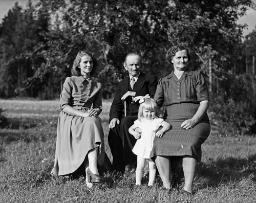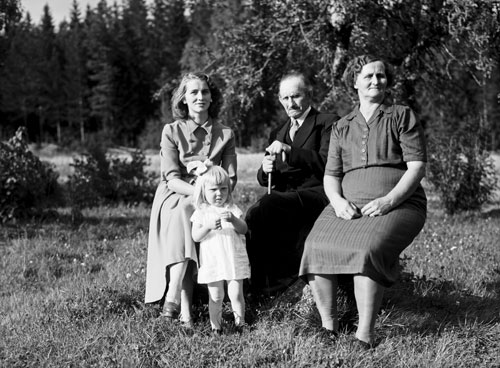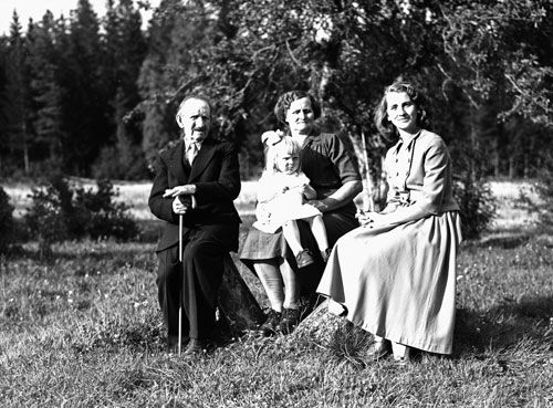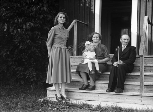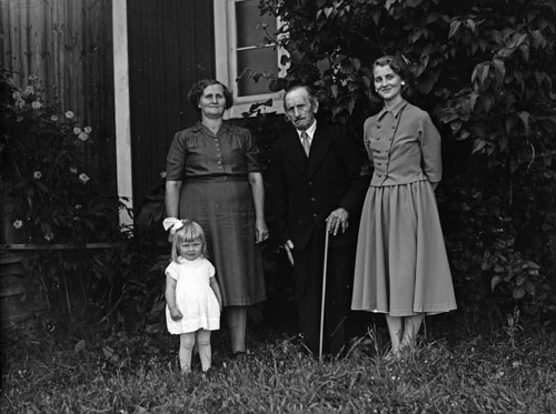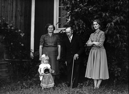 Bildtext: Stina och Wilhelm Jonsson, Dånsjön, Överby, Forsa samt dottern Virginia och barnbarnet Ann-Christin. Kortet taget 22/8 1949. Frejs, Överby.