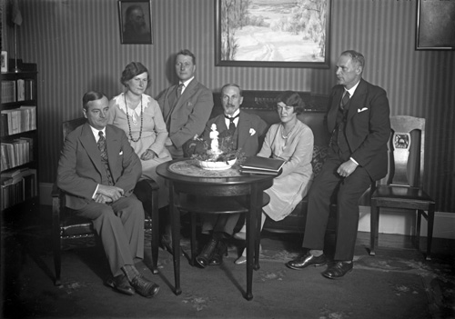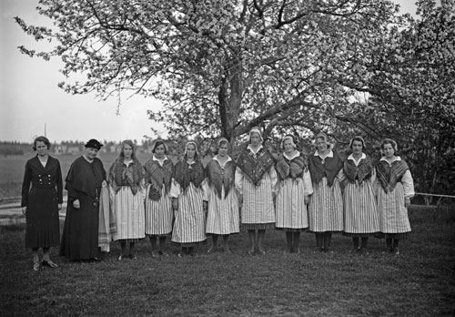 Bildtext: S.L.U., Bygdegården, Klångsta, Forsa. Grupp av kursdeltagare med fru Rodenstam, Hudiksvall. Näst längst till höger kan vara Emma Nyman Lumnäs, Forsa f.1904 d.1958. G.Jonsson i Fårsvea, Forsa. Katarina Wilhelmsson säger att fjärde från vänster är Olga Johansson, Ransta.