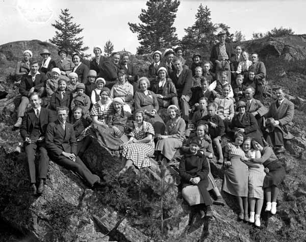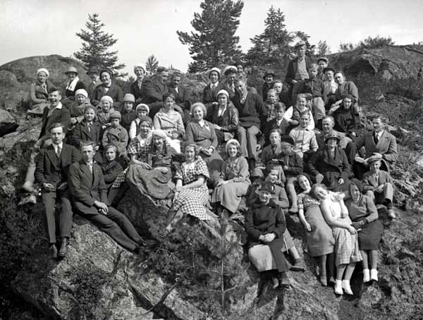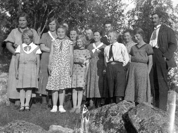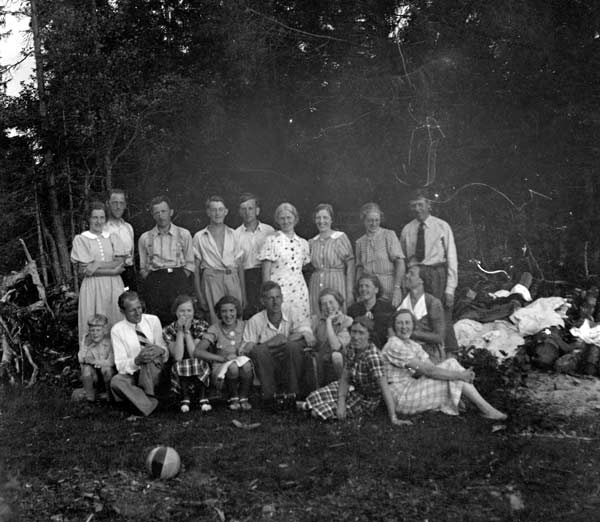 Bildtext: Utflykt från Backa till Stenberget. Liten bergkulle öster om Middagsberget, en soldat Sten bodde förr nedanför berget. (Enl Lars Larsson 1933, SOFI). Stående: Ivar Johansson, Algot Larsson, Anton Nilsson, Ingmar Andersson (Kälkebo), Alfred Rask, Johan Nilsson, Nils Johansson, Manne Johansson. I mitten: okänt barn, Per Nilsson/Nanstad, Martin Nilsson, okänt barn, okänt barn. Från vänster sittande: Aina Karlsson, Per Berglöf, Johan Johansson. Till höger mellan sitter: Kristina Jonsson (Elsas Kristin i Trogsta), Olga Johansson, Anna Olsson från Järvsö, Margret Andersson/Johansson. Främst från vänster: okänd pojke, Astrid Rask, Sigrid Johansson, Inga Rask/Ullmark, Ingrid Johansson/Nilsson, Hulda Johansson/Lidberg, Göta Öst, Stina Nilsson/Anderson, Brita Öst. Maj Holm och Ingrid Karlsson ligger framför.