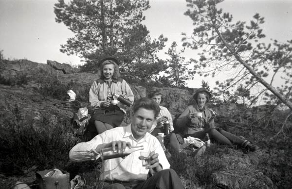 Bildtext: Gökotta på Middagsberget 1943. Okänd, Arne Anderson, Trogsta, okänd, Anna Nilsson, Trogsta.