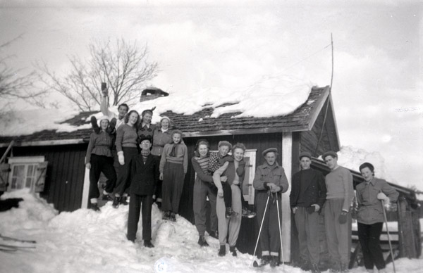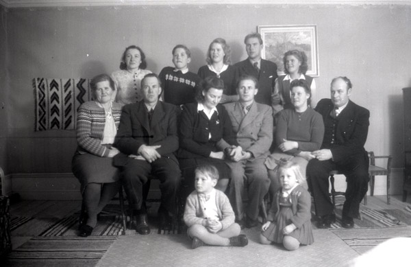 Bildtext: Jonas Swanson från Amerika på sverigebesök hos sina fyra syskon i Trogsta, november 1947. Stående: Per Bergström, Nils och Naemi Bergström, Karin Bergström, Per Andersson, Oskar Lönn, Alma och Olle Lönn, Erik Bergström. Sittande: Arne Anderson, Kristina Bergström/Eriksson och Erik Eriksson (Per-Ers Erske), Mina Bergström/Andersson, Jonas Swanson, Karin Bergström/Lönn, Hanna Bergström. Sittande på golvet: Brita Eriksson, Olle Bergström, Sven-Olov Lönn, Anne-Maj Bergström, Karin Lönn/Svedman.