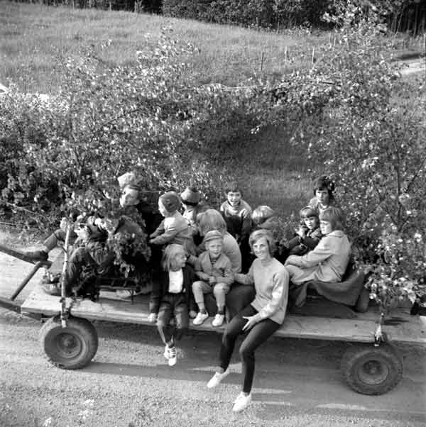 Bildtext: Trogstabarn sjunger på gökotta. Från vänster främre raden: Lennart Ovanfors, Torsten Ovanfors, Tomas Åkesson, Margareta Åkesdotter, Annelie Gunnarsson och Kristina Ovanfors. Bakre raden: Okänd, Solgerd Sand, Lena Carlsson, Okänd och Okänd.