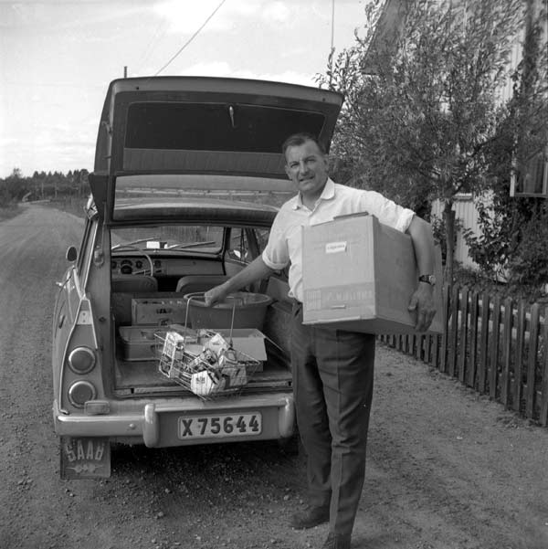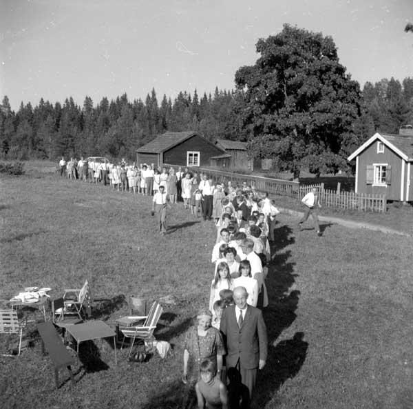 Bildtext: Släktträff Nirses Trogsta 3, ägare Johan och Linnéa Nilsson. Initiativtagare Johan Johansson. Reportage i HT 17 juli 1966: 120 släktingar möttes i skogen.