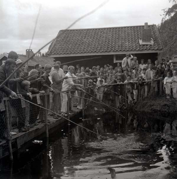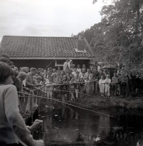 Bildtext: Här avgörs fisketävlingen på Trogstavallfesten 1970 av Sven-Olov Lönn. Från höger Ulf Brandt Rumsta och Bror Berglöf Rumsta.