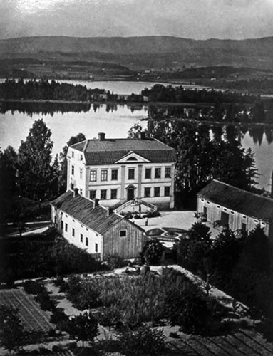Bildtext: Gamla "handelsbolaget" i Lund, Forsa. Okänd kvinna med ko. Det ljusa huset till höger är Betel-kapellet som också tjänade som skola och söndagsskola.