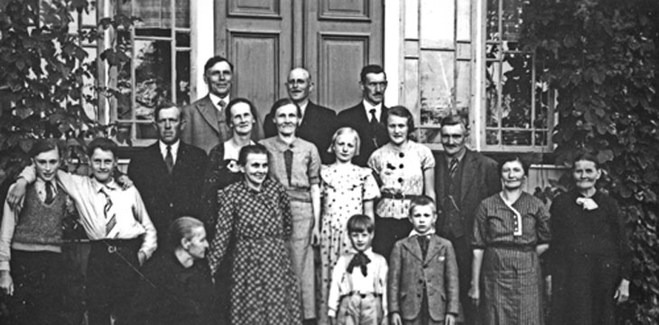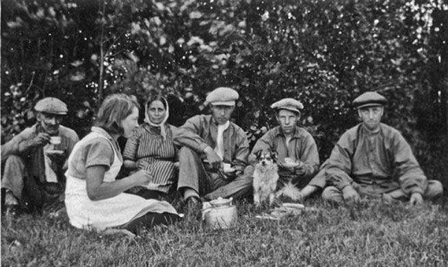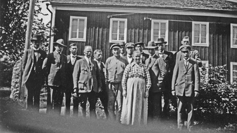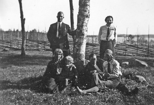 Sittande från vänster: Per Nilsson (PostPelle), Sara (Petters piga från Härjedalen), Nisse Eriksson. Längst bak från vänster: Lars Nilssson, Linnéa Mattsson (Månsson), Hilding PH Lindh, Karin Andersson (Fredlund) och Martin Bergström Tåsta (Ludvigs son)