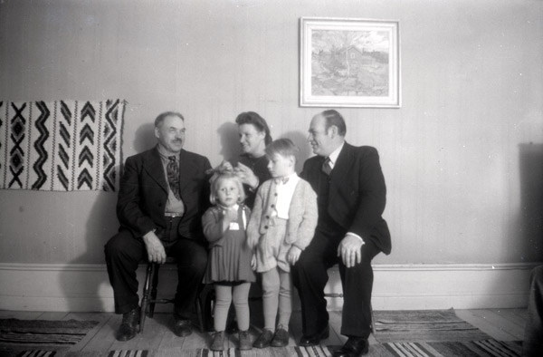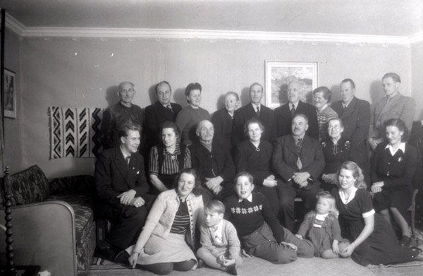 Bildtext: Jonas Swanson från Amerika på sverigebesök hos sina fyra syskon i Trogsta, november 1947. Stående: Per Bergström, Nils och Naemi Bergström, Karin Bergström, Per Andersson, Oskar Lönn, Alma och Olle Lönn, Erik Bergström. Sittande: Arne Anderson, Kristina Bergström/Eriksson och Erik Eriksson (Per-Ers Erske), Mina Bergström/Andersson, Jonas Swanson, Karin Bergström/Lönn, Hanna Bergström. Sittande på golvet: Brita Eriksson, Olle Bergström, Sven-Olov Lönn, Anne-Maj Bergström, Karin Lönn/Svedman.
