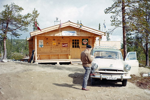 Okänd man vid bil (märke? årsmodell?) framför kaffestugan Karl XI (okänd plats). Skyltar på stugan: Coca-Cola, Champis, Loranga, Syd-Apelsin. Utflyktsmål? Enligt Håkan ? är det en Standard Vanguard ca 1958. Troligen Olle Heds bil. Olle och Erik hade en sådan bil.