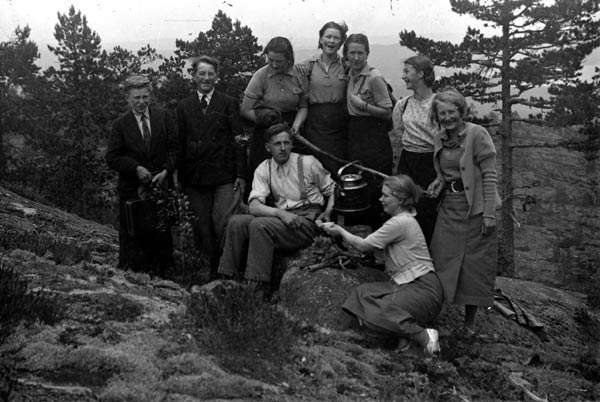 Bildtext: Utflykt från Backa till Långholmen 1934. Stående från vänster: Alfred Rask, Ivar (Snäll) Johansson, Per Nilsson/Nanstad, Erik Johansson, Ingmar Andersson (Kälkebo), sex okända, Elin Blank/Nilsson, fem okända. Sittande från vänster: Hulda Johansson, Aina Karlsson, Lars Johansson, Margret Andersson/Johansson, Anna Åslin, Astrid Rask, Astrid Karlsson, Selma Olsson, Ingrid Johansson/Nilsson, Anna Nilsson, Lydia Wallin med Rut Holm, okänd, Johan och Linnea Grad/Nilsson, okänd, Martin Nilsson, Olle Lönn, Per Magnusson, okänd.