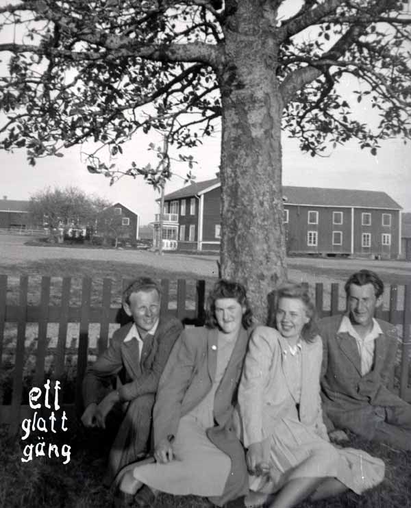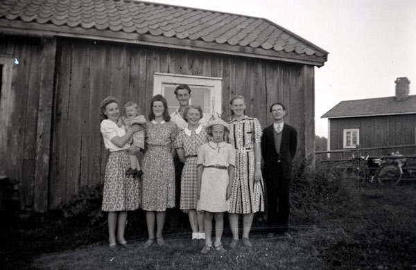 Bildtext: Jonas Swanson från Amerika på sverigebesök hos sina fyra syskon i Trogsta, november 1947. Stående: Per Bergström, Nils och Naemi Bergström, Karin Bergström, Per Andersson, Oskar Lönn, Alma och Olle Lönn, Erik Bergström. Sittande: Arne Anderson, Kristina Bergström/Eriksson och Erik Eriksson (Per-Ers Erske), Mina Bergström/Andersson, Jonas Swanson, Karin Bergström/Lönn, Hanna Bergström. Sittande på golvet: Brita Eriksson, Olle Bergström, Sven-Olov Lönn, Anne-Maj Bergström, Karin Lönn/Svedman.
