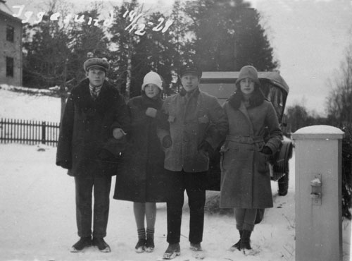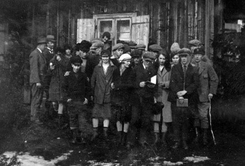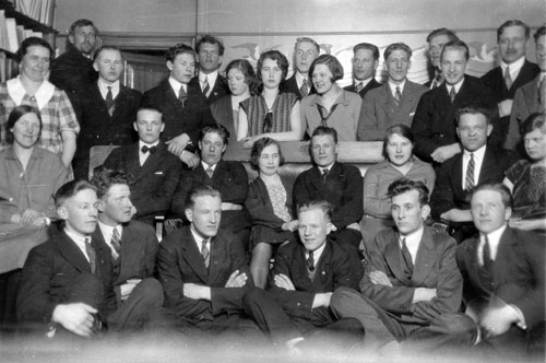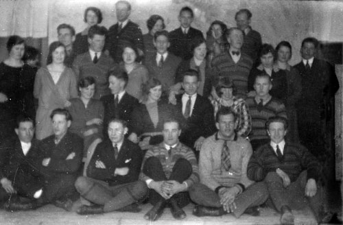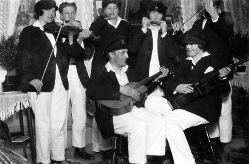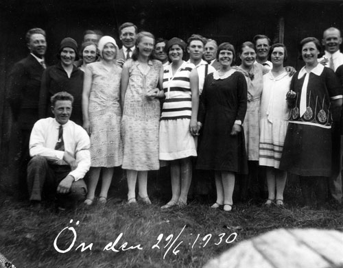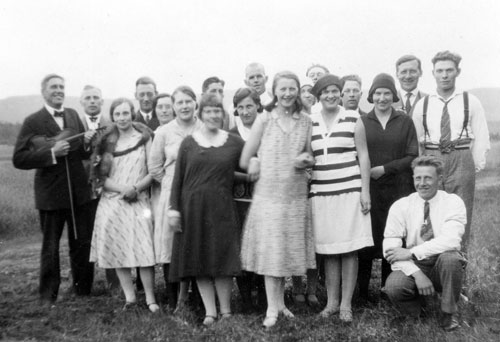 Bildtext: Tredje från vänster Helga Andersson och därefter Olle Byström. Tredje från vänster med boa, Hilma Byström. Nionde från vänster Milly Reinholdsson och därefter Pelle Hallin. Femte från höger Per Frank.