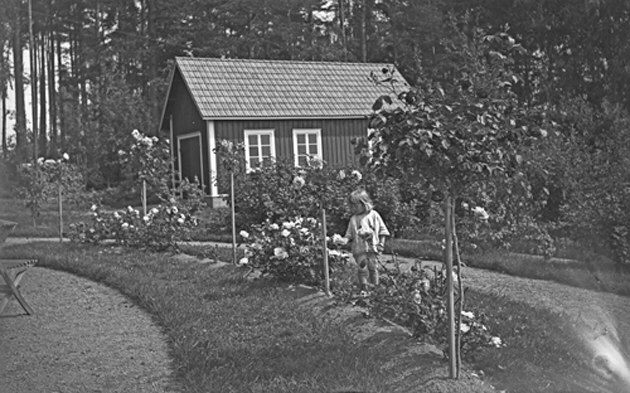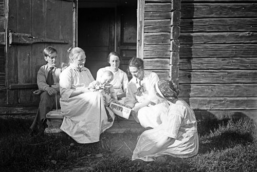 Bildtext: Besök i fäbodstugan i Ofärne sommaren 1923. På bron från vänster: Anders Eriksson (Klångsta), Karin Nilsson (Klångsta), Svan Anna (Bopiga), Märta Eriksson (Lund). I knät: Erik Nilsson (sedermera polismästare i Hudiksvall) I gräset: okänd kvinna.