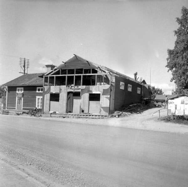 Bildtext: Rivning av gamla Handelsbolagets byggnad i byn Lund (Sörforsa). Ny byggnad uppförd vid fyrvägskorsningen. Nu benämnd ICA Forsa, före detta Forsahallen. I bakgrunden Udéns fastighet, innehållande bl a butik.