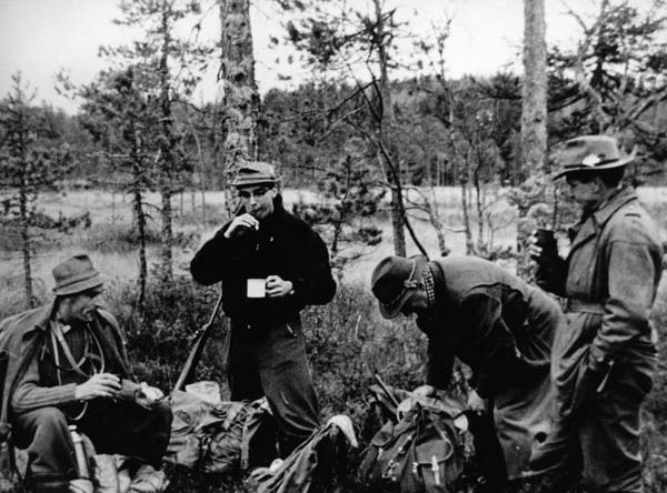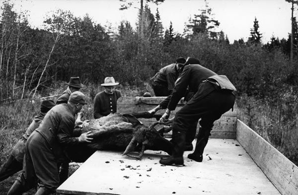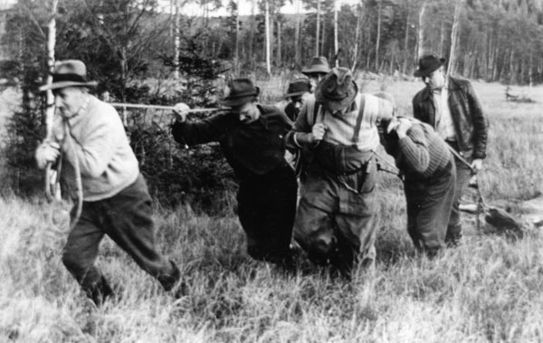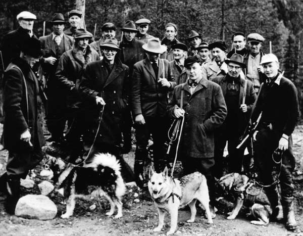 Bildtext: Jag hittade ett tidningsurklipp dat 13/10 1956 med detta foto och rubriken "I älgarnas spår vid Blaxåsberget". En lång spännande artikel med flera foton där MJ beskriver inlevelsefullt om några jaktdagar i Blaxås. Där står uppräknat alla namnen (från vänster) Svante Tillander, Hilding Olsson, Fritz Klar, Per Olsson, Sören Tall, Mickel Larsson, Johan Sjöberg, Gustav Viberg, Nore Norell, Erik Jonsson, Åke Grad, Pelle Eriksson, Sven-Erik Tillander, Per Ljusberg, Johan Grad, Sven Mood, Bruno Östberg, Ingvar Albinsson. Längst fram står jaktledaren Herbert Persson med Jack. De två andra hundarna är Tasso och King. / Helena Persson Ovcina sökord: gevär, älgjakt, hund motivkategori: jakt och fiske id:20288 Fotograf: Alf Östberg fotoår: Säkert 1956 bildnummer: ALO-086 förening: Forsa Sockens Hembygdsförening land: SE motivplats: teknik: Inskannad påsiktsbild, 48-bitars färg, 800 dpi, 13,7 X 17,6 cm rättighet:(föreningen ovan om ej annat anges.) Forsa Sockens Hembygdsförening originalplats: (visas ej publikt) släktboken: publiceras: ja säljas: tidigare nr: samling: Alf Östberg skick: reg av: KO reg datum: 2026-01-13 |