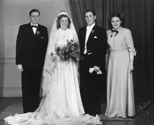 Sökord: brudpar, bröllopsvittnen, män, kvinnor Motivkategori:bröllop Id:2572 Fotograf: Undén Fotoår: 1949 Bildnummer: Ekjer009 Förening: Njutånger Hembygdsförening Land: sverige Motivplats: Gävleborg, Hudiksvall Teknik: inskannat s/v foto Rättighet: privat Originalplats: (visas ej publikt)