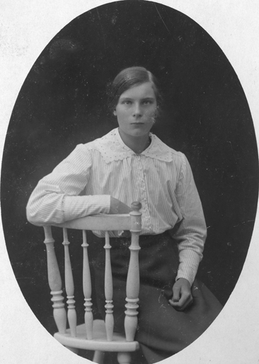 Bildtext: Stående fv Anna Hedlund med maken skräddare Olof Hedlund, född i Mörtsjö senare bosatt i Fegärde. Sittande deras döttrar f v Ester, Valborg och Vilhelmina(Helmina). Pojken i mitten är Tage Landerud, dotterson till Anna och Olof