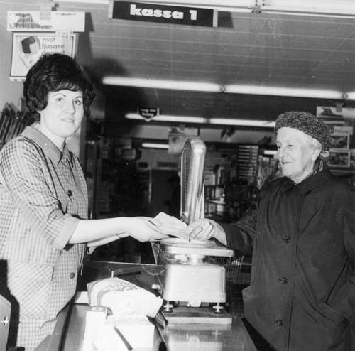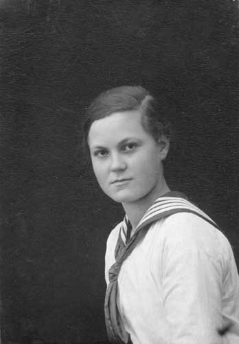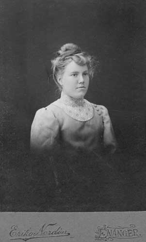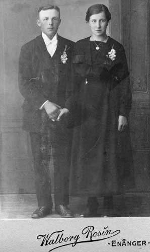 Bildtext: f.v: Brita Bodin, Anna Jonsson, okänt barn, Bricken född Bodin, Birger Bodin o Elsa Brant från Arbrå, Elin Persson, Erik Nilsson, Änga, Ester Nilsson, Änga, Nanny Bodin