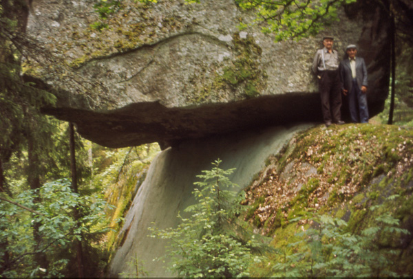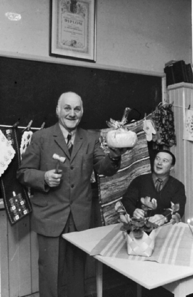 Bildtext: Auktion i Jonstorp, en hemost ropas ut. Åke Nilsson sitter bredvid och Josef Samuelsson Torpa håller i klubban(Bertils far).