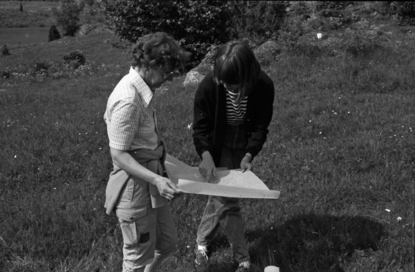 Bildtext: Torpvandring 840617. Gravröse vid Oppeby. Sven Johansson, Henry Svensson, Birgitta de Pomian-Sandell. Vet någon fler ?