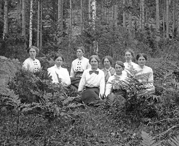 Bildtext: Åtta kvinnor ute i skogen. Till vänster de tre systrarna Olsson, Rutsbo, längst till höger Hildur Johansson. Vet någon mer ?
