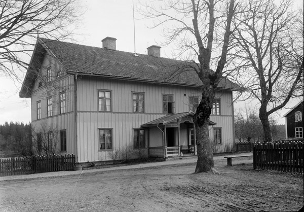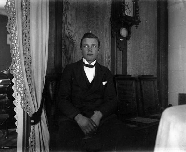 Bildtext: Fyra ynglingar vid en gärdesgård. Från vänster, Bror Johansson i Gölstugan, Boda, Erik i Utjorden, Mulestad, Harry Johansson i Boda (Postiljon), Sten Bergström