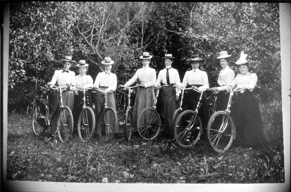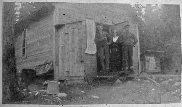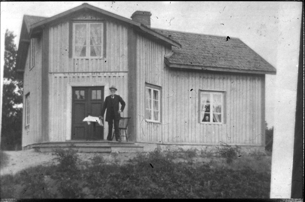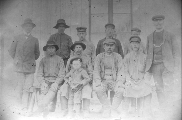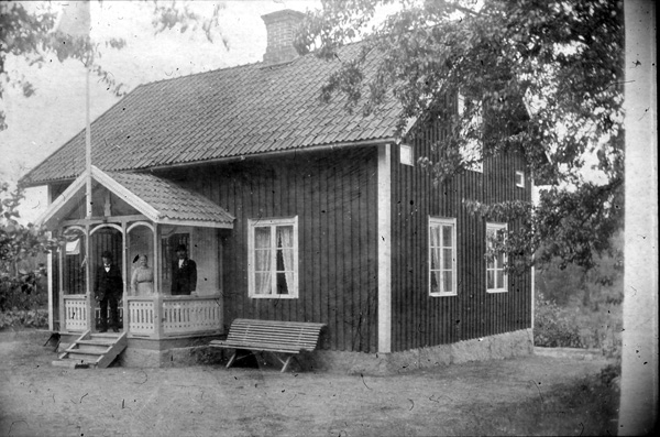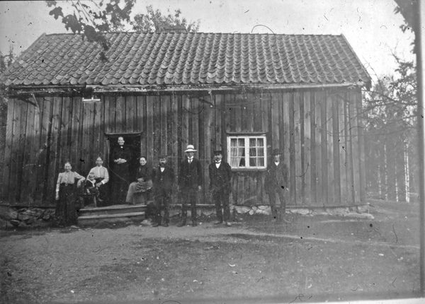 Bildtext: Eka grund byggs. 1908-1909. Från vänster 1. Axel Larsson, 2. okänd, 3. Einar Karlsson (bror till Ture Karlsson i Frö), 4. Edvard Johansson (stensättare), 5. Axel Hjort, 6. Verner Jakobsson, 7. Axel Johansson (far till Sven Johansson i Stenåsa), 8. Johan Vinu, 9. Axel Kling