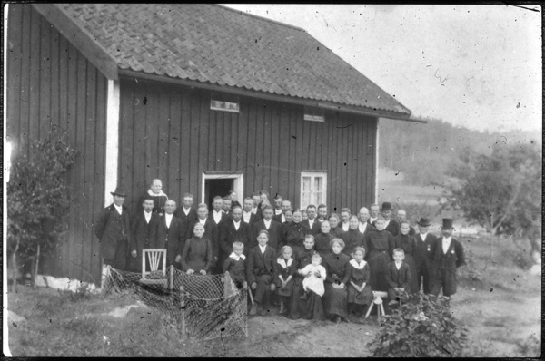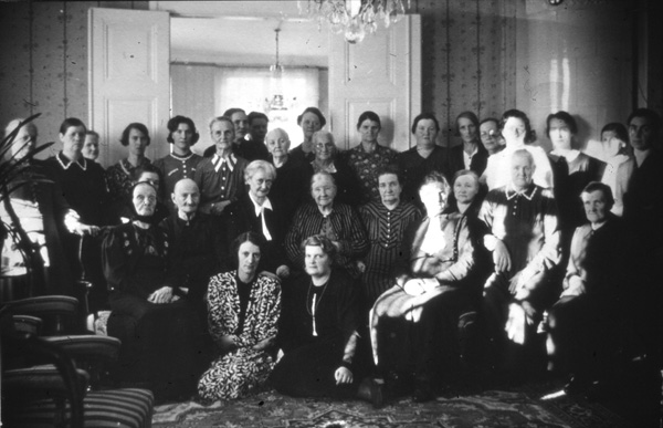 Bildtext: Kalas på Ogestad 10/10 1943, Barbro Abrahamssons mormor fyller 75 år. Bilden är tagen vid Mia Liljenstolpes 70-års kalas på Ogestad 10/10 1943. Bakre raden syns bl.a. Berta Nilsson, Signe Karlsson, Elsa Viberg, Ester Karlsson, Hulda Nilsson, Berta Jakobsson, Selma Wilén, Ester Larsson, Beda Forsberg, Edit Johansson. Höger om kakelugnen Frida Jakobsson, Nanny Hallberg. Främre raden syns bl.a. Mia Liljenstolpe, Ester Johansson, Hilda Jakobsson, längst till höger Amanda Johansson. Sittande på golvet Gunvor Bröme och Karin af Ekenstam. se även CB_Repro_0113.jpg