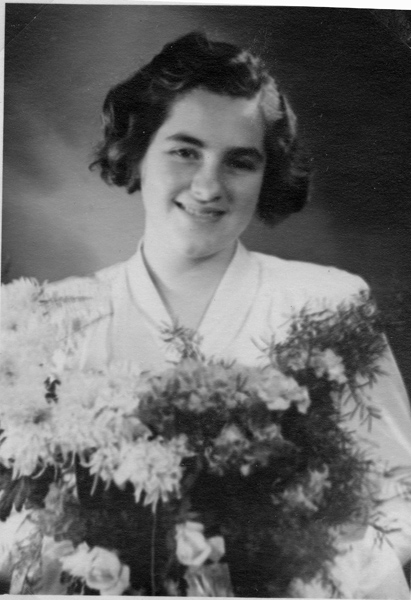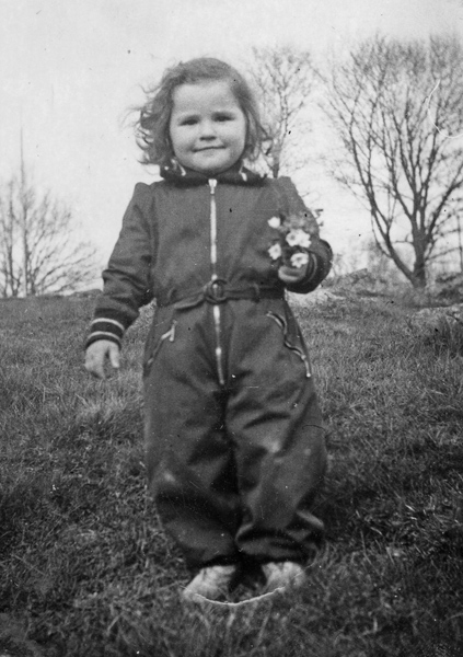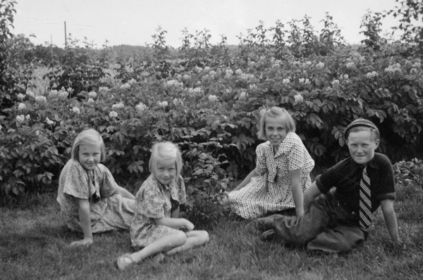 Bildtext: Britta Nilsson, Majken Nilsson, Margareta Nilsson och Åke Nilsson i trädgården i Norråker, Karrum.