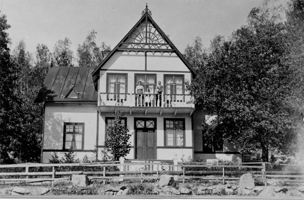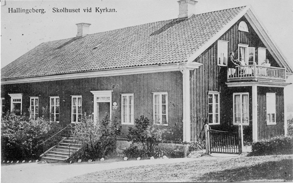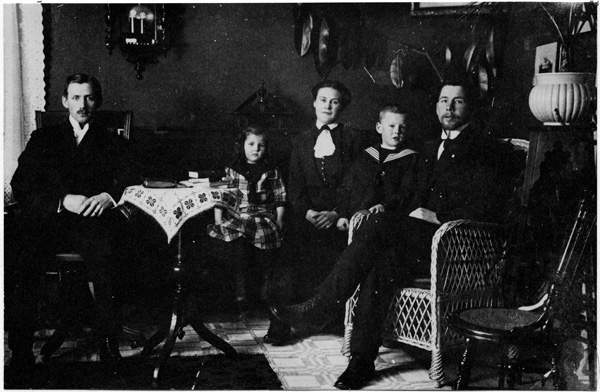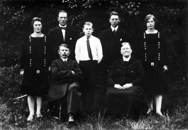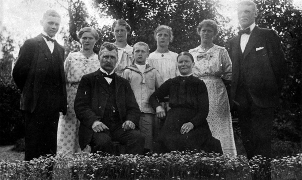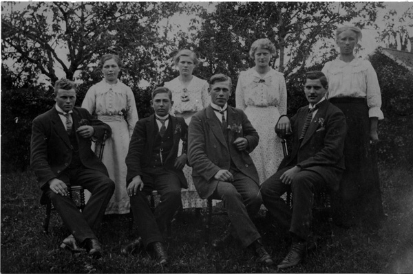 Bildtext: Övre raden: Helga Wennerberg, Edit Johansson, Gunhild Johansson, okänd. Sittande: Sven Gustavsson, okänd, Rikard Eriksson, okänd. Rikard Eriksson är morfar till Per-Inge Linderson, Jonstorp. Bilden är troligen tagen I Hunsala möjligen Smitterstad.