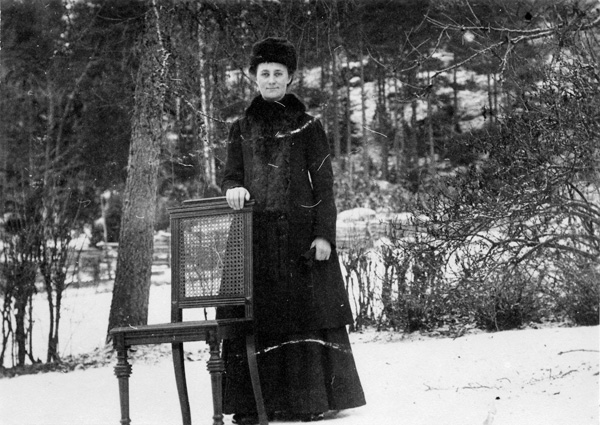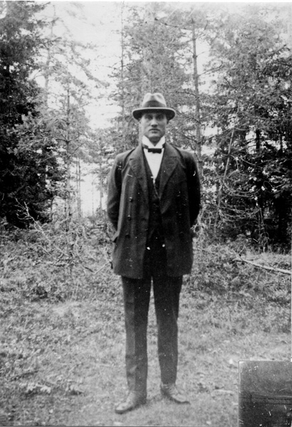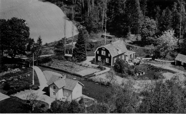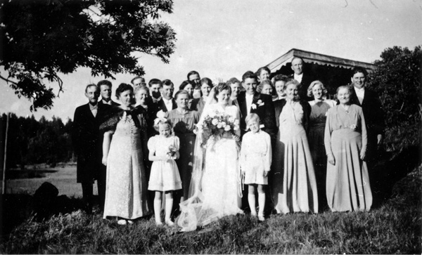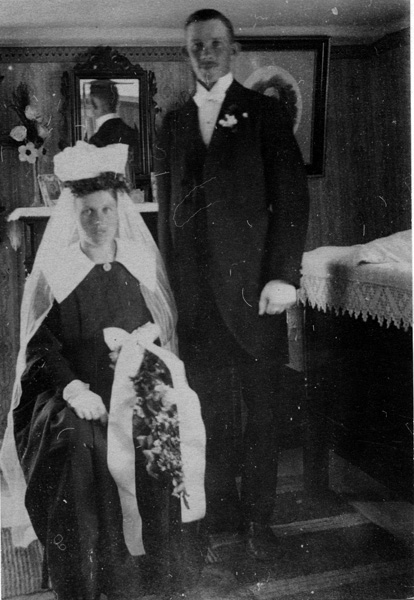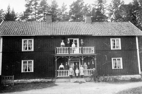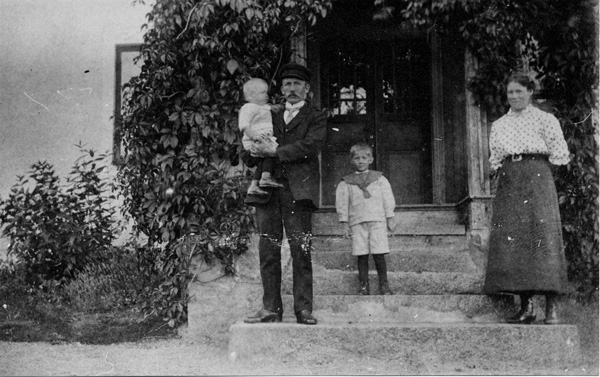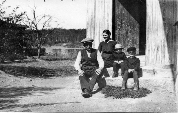 Bildtext: Kaleb Gustavsson, Signe Gustavsson, Sigvard Gustavsson och Ingvar Gustavsson. Bilden är troligen tagen på förstu´bron till Sandbo omkring 1920. I bakgrunden syns Sandsjön, Sando är nu borta.