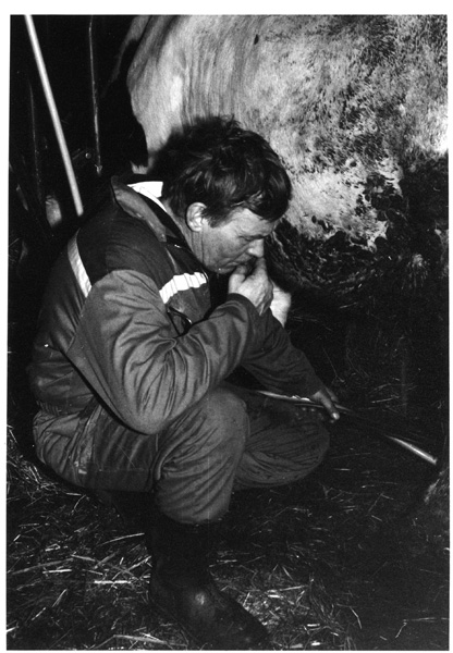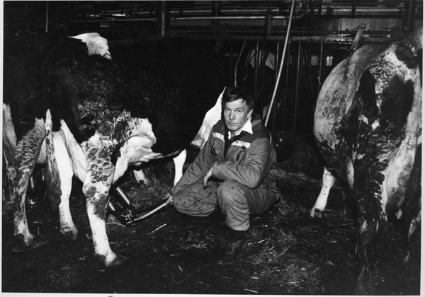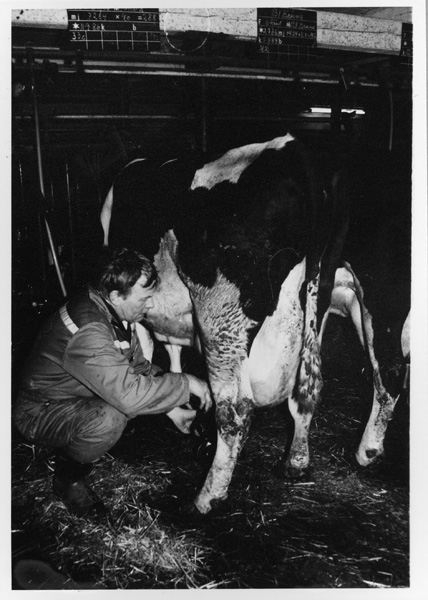 Bildtext: Bildserie med bilder av Nisse Nils-Göran Werner när han mjölkar i Karrums ladugård 23/2 1991. Lantbrukare Nils-Göran Werner tog över som mjölkproducent på Gården Karrum 2:2 i mars 1962 och upphörde med det 29 år senare den 25 februari 1991.