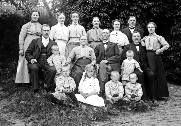 Bildtext: Stående längst bak från vänster: 1 ) Signe Viktoria Petersson (gift Svensson) född 20 feb 1885 i Sankt Olai, Norrköping. 2 ) HELMI Mathilda Elisabet Svensson (gift Jonsson) född 14 feb 1886 i Norra Stenserum, Hallingeberg. 3 ) okänd. 4 ) ANNIE Elvira Theresia Svensson (gift Karlsson) född 24 nov 1889 i Frösvid, Odensvi. 5 ) ALMA Augusta Svensson (gift Andersson) född 21 jan 1878 i Norra Stenserum, Hallingeberg. 6 ) Jakob AXEL Andersson född 3 apr 1875 i Eneby, Odensvi. 7 ) Ellen Maria Svensson (gift Holm) född 14 feb 1883 i Norra Stenserum, Hallingeberg. Sittande från vänster: 1 ) Karl Gustaf Verner Svensson född 9 jan 1880 i Norra Stenserum, Hallingeberg. 2 ) Johanna Mathilda (THILDA) Karlsdotter (gift Svensson) född 1 jan 1855 i Gellerstorp, Odensvi. 3 ) Sven August Svensson född 4 jun 1853 i Frösvid, Odensvi. 4 ) Karl Georg Holm född 8 jan 1873 i Norra Ljunga, Jönköping. Barnen framför från vänster: 1 ) Nils Erik Svensson född 19 feb 1912 i Sankt Olai, Norrköping. 2 ) Karl Elof Svensson född 29 mar 1906 i Matteus, Norrköping. 3 ) Margit Viktoria Svensson född 3 nov 1907 i Östra Eneby, Östergötland. 4 ) Sven Oskar Svensson 1 dec 1909 i Östra Eneby, Norrköping. 5 ) KARL-AXEL Daniel Holm född 17 mar 1913 i Skärkind. 6 ) SVEN Georg Johannes Holm född 12 jan 1910 i Viggeby Storgård, Skärkind. Samma personer finns även på AXSV013. /// Information från: Annika Ekström