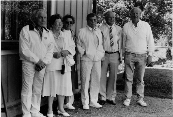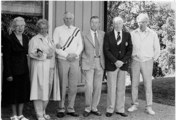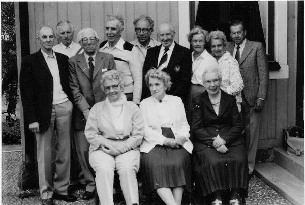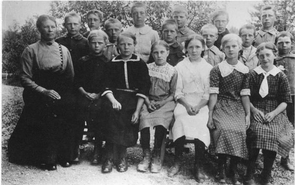 Bildtext: Kort från skolträff i Stora Skälhems skola 1988-06-11: Elever i Stora Skälhems skola åren 1910 - 1930. Bakre raden fr v Sture Karlsson, Birger Karlsson, okänd, okänd, Helge Rosén, Börje Svensson, Siri Strömsten, Elsa Svensson Rosén, Sigvard Gustavsson. Främre raden Signe Wennerberg, Okänd från Hagalund, Dagny Johansson.