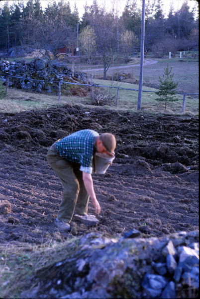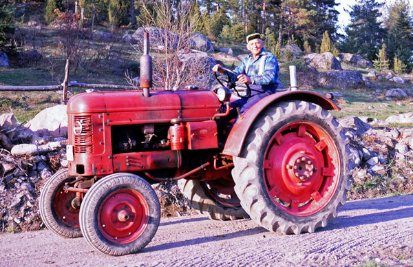 Bildtext: Kalle (Karl Pettersson, Kullen, Källarhult) på traktorn VOLVO T 31 // Volvo T 33 var en variant av T 31-modellen, dvs. 36 hkr och med längsställd 5-växlad växellåda och portalbakdel med slutväxlarna ute vid bakhjulen. Tillverkades 1950 - 1956. T 33 skiljde sig från T 31 genom att vara högre byggd, lite amerikanskt radodlingsinspirerad, med teleskopiskt ställbar framaxel och med större och smalare bakhjul, 11 - 38 tum. Bland svenska lantbrukare användes den kanske inte alls för radodlingar, men de höga bakhjulen uppskattades för att ge bra grepp. Efter Volvos köp av BM kom modellen 1952 i dieselversion som BM 36 och Volvo T 36 med 42,5 hkr., blev mycket populär och tillverkades till 1959.