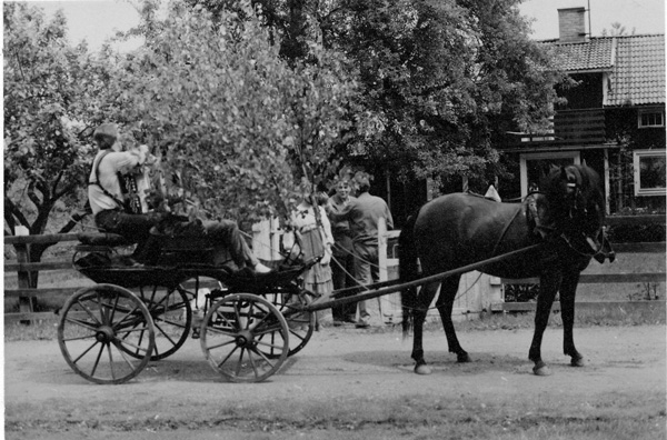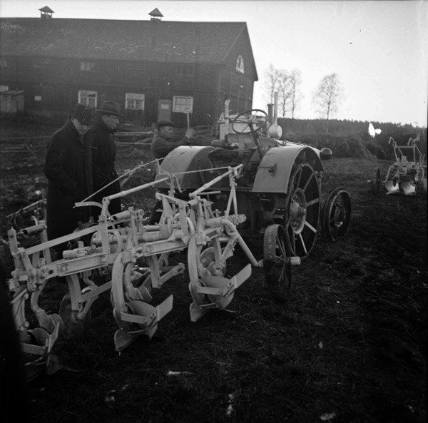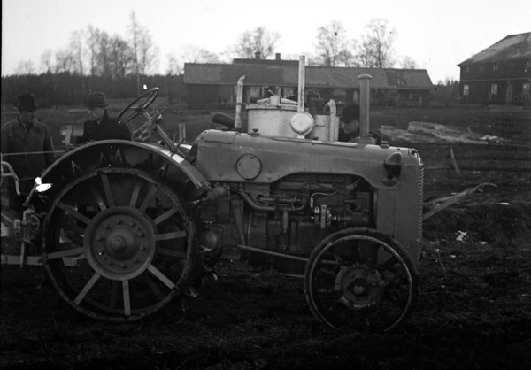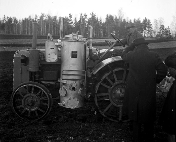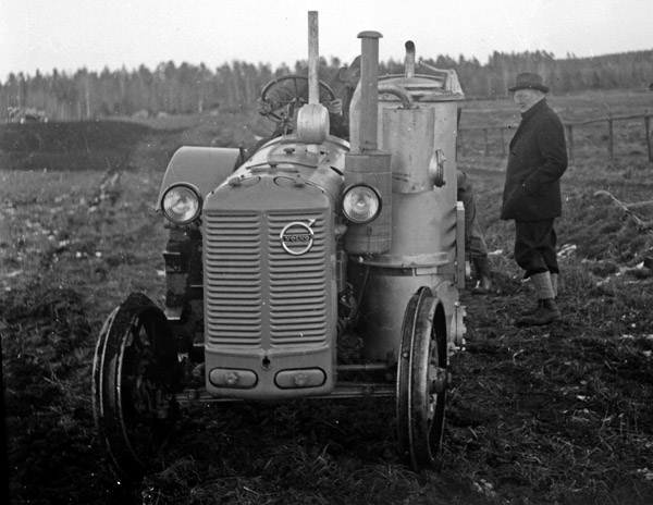 Bildtext: En traktor av märket Volvo, ombyggd för gengasdrift, testkör Överums Bruks nya Delfinplog. Mannen på bilden är Överingenjör Claes Berg Överums Bruk. Hösten 1943 // Volvos allra första traktor, T 41, kom 1944 och var fabrikstillverkad med gengasaggregat från Hesselman. Till skillnad från ombyggda traktorer hade den gaskylare och gasrenare inbyggda under huvplåtarna och såg därför "renare" och elegantare ut. Själva aggregatet gick dock inte att dölja. Den hade en 4-cyl. 40 hkr Volvomotor, kombinerad med en 5-växlad bakdel med tvärställda axlar och drev, tillverkad av Bolinder-Munktell, f. ö. samma bakdel som för Munktells samtida GBMV-1/BM20, dock annan utväxling. Traktorn var då försedd med järnhjul, eftersom gummi var bristvara under kriget. Hade eldriven startfläkt för gengasen och elstartmotor 1946, när kriget var slut, byggdes T 41-orna om till Hesselmanmotor, (insprutning och tändstift), vilket konstruktionen redan var planerad för och motoreffekten ökade till 48 hkr. I detta utförande och med gummihjul serietillverkades den sedan modellen till 1950 under beteckningen T 43. En svensk traktorklassiker!