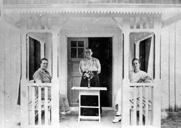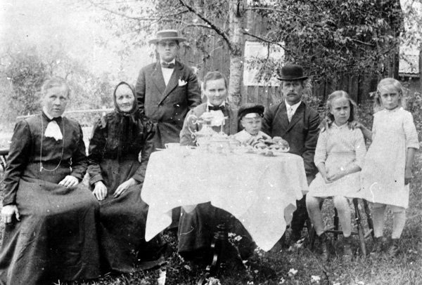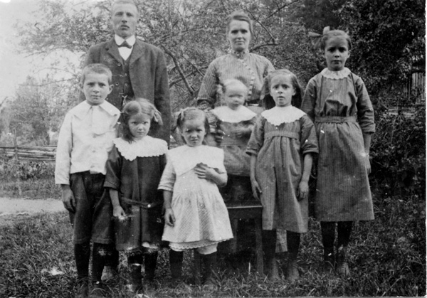 Bildtext: Makarna Verner och Amanda Johansson i Öjastugan år 1914. Med barnen från vänster Olof, Alva, Elna, Lilly, Gunborg och Ingrid.