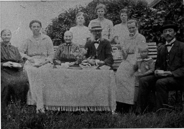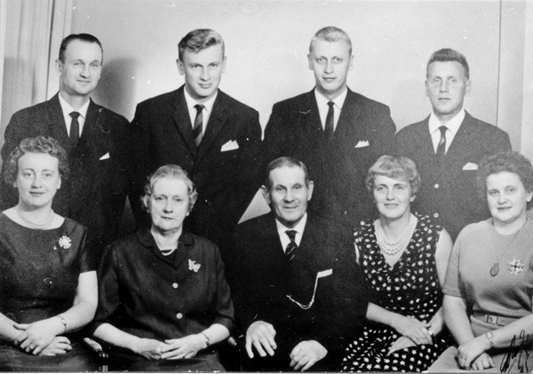 Bildtext: Repro från Lisa Petterssons (Kullen, Källarhult) album 324 - 329. Makarna Marta o Erik Säberg flankeras T.V. av dottern Margit och T.H. av döttrarna Majbritt o Märta, stående F.V. sönerna Nils-Erik, Gösta, Sven o Lars. På 1960-talet.