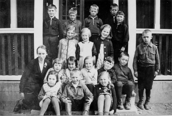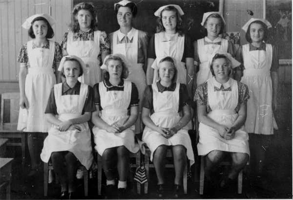 Bildtext: Skolkökselever i Odensvi skola år 1943 1. Mary Lindgren, Lövik 2. Ulla Karlsson, Susebo 3. Maj-Britt Svensson, Stockholm 4. Ebba Karlsson, Smedjebacken 5. Ing-Britt Andersson, Rödsle 6. Asta Karlsson, Snärsfall 7. Kajsa Pettersson, Odensvi, skolköks-lärarinna 8. Sonja Odén, Karlstorp 9. Anna-Lisa Lindersson, Rosenburg 10.Sonja Jakobsson, Rödslestugan (samma som bild RG_8-17)