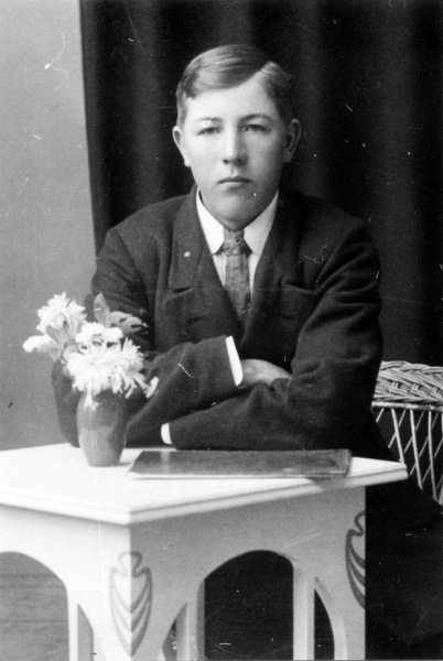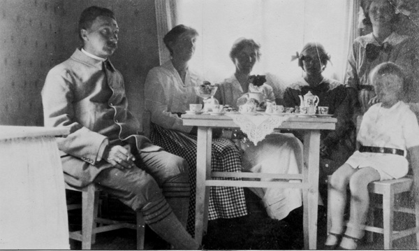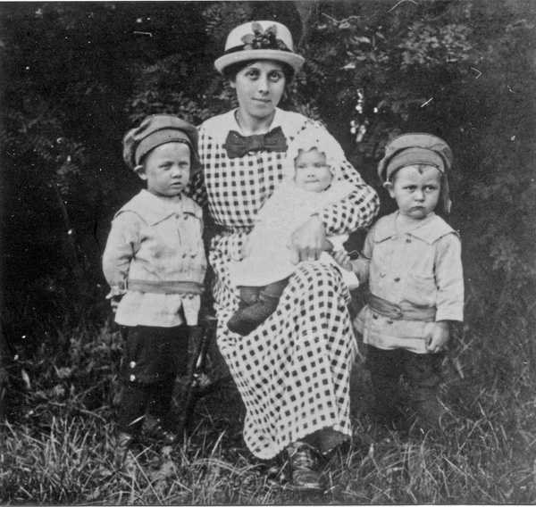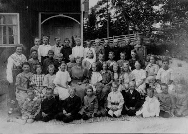Bildtext: Larum i Dalhem. Längst upp T.V. Josef Fr.v. Kerstin mor till Signe o Hugo Karlsson med barnen Rut, Gösta, Tore, Margit och Ellen. Framför barnen, Kjell Andersson.