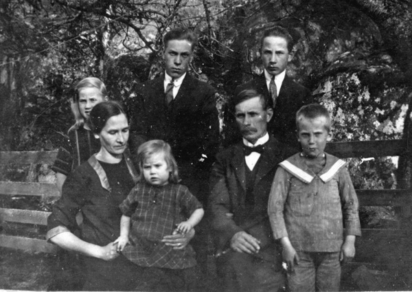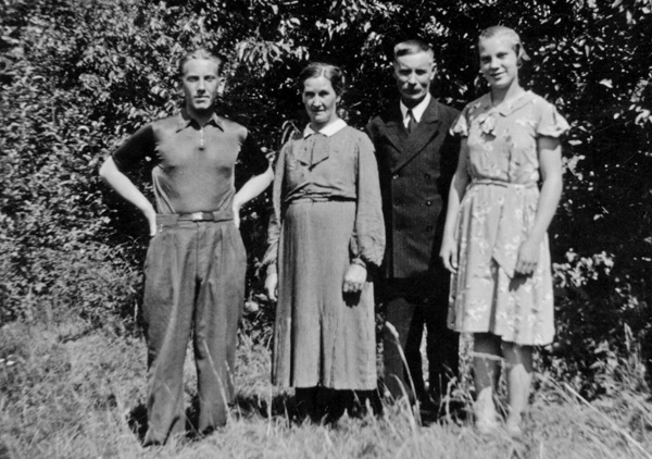 Bildtext: Medaljutdelning på Odensviholm troligen på 1940-talet. Personerna på bilden heter: Bakre raden från vänster är Sten Lindersson, Gunnar Larsson Trädgårdsmästare, Petersson Skogvaktare,