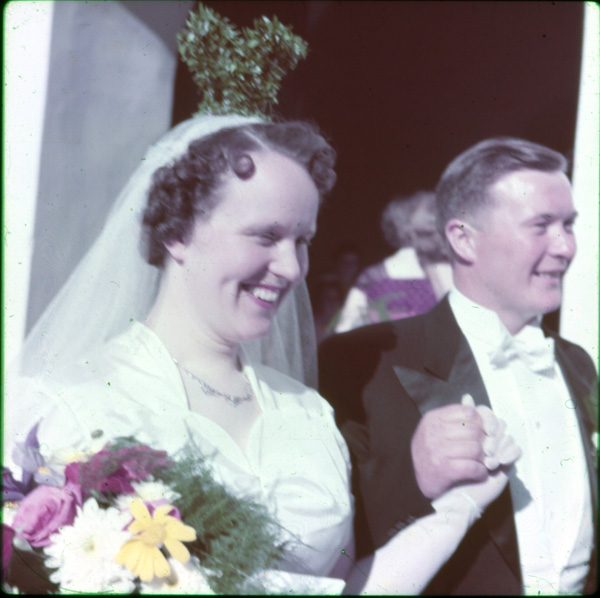 Bildtext: Bröllop i Odensvi kyrka 1955 mellan Åke Nilsson, Karrum och Sara Lindgren, Lövik, Odensvi. Se den fina brudkronan, myrten ?