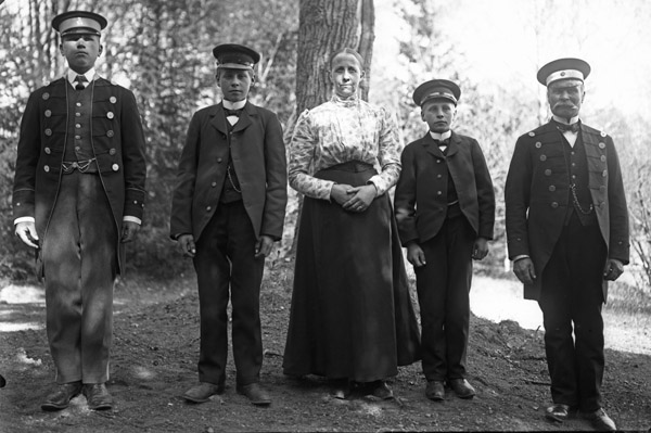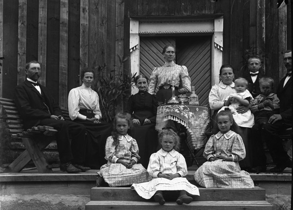 Bildtext: Ett sällskap framför ett hus, troligen Kullen, Boda. Vet någon mer ? se även EO601 /// Från vänster övre: Viktor, Augusta, osäker (på namn men mor till: Viktor, Augusta, Alma, Albin) sedan Alma, Charlotta(Lotten)osäker på barn namn mellan Charlotta och Albin. Längst till höger övre Albin (August)