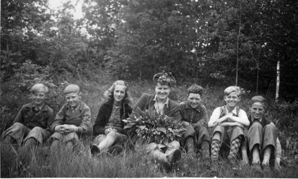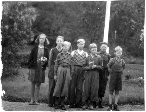 Bildtext: Skolkort från Möckelhults skola 1948. Fr.v. Berthold Zeylon, Svenstorp, Karl-Olof Gustafsson, Gössebäck, Margareta Nilsson, Charlottenborg, Lärarinna Alice Lindberg, Henning Karlsson, Gällerstorp, Karl-Henrik Zeylon, Svenstorp, Karl-Erik Karlsson, Stuverum.