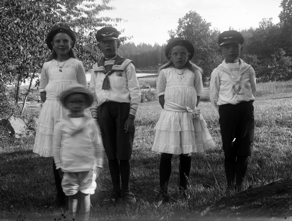 Bildtext: Fem barn, kanske syskon, i fina hattar/kepsar stående ute. Samma barn finns på bild EO667. Vet någon vilka de är ?