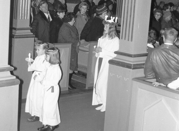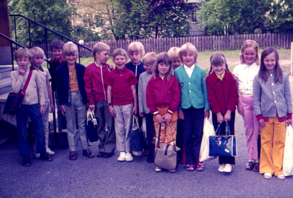 Bildtext: En samling skolbarn väntar med sina skolväskor utanför Odensvi skola. Från vänster Nils-Erik Wall, Stefan Svensson, Mikael Jakobsson, Lars Johansson, Olof Mårtensson, Evert Svensson, Lars Andersson, Börje Karlsson, Susanne Bergqvist, Gunnar Sand, Marie Blomberg?, Ingrid Nilsson, Carina Pettersson, Irma Pettersson