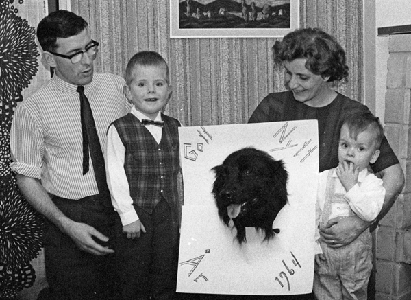 Bildtext: Familjen Mårtensson i Äppelbo, Odensvi önskar Gott Nytt År 1964. Kjell Mårtensson, Lars Mårtensson, Tomas Mårtensson, Marianne Mårtensson och hunden Nalle.