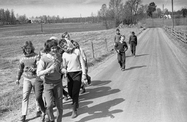 Bildtext: Ett antal skolbarn är ute på vandring mot Eneby. Notera det fina staketet på höger sida. Lilian Lindersson, Birgit Andersson,Birgitta Andersson, Göran Karlsson, Per Forsberg , Beng-Inge Gustavsson.