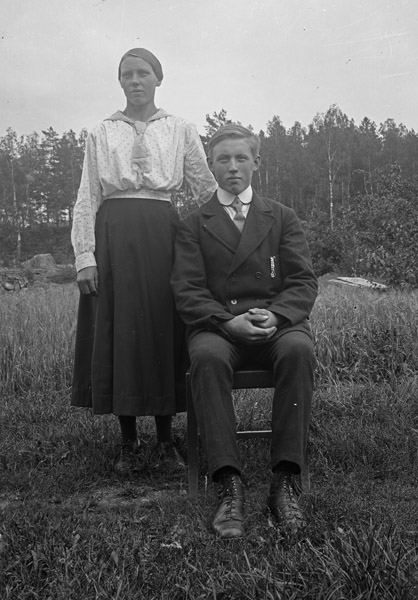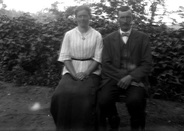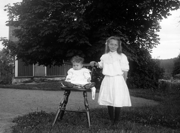 Bildtext: Hildur Lovisa Kristina Svensson född Nilsson, den 25 okt 1885 i Udden, Odensvi socken. Död 30 jan 1966. Föräldrar: Gottfrid och Lovisa. Kortet är taget i Helgsjönäs (Forshag) med hunden Nelly.