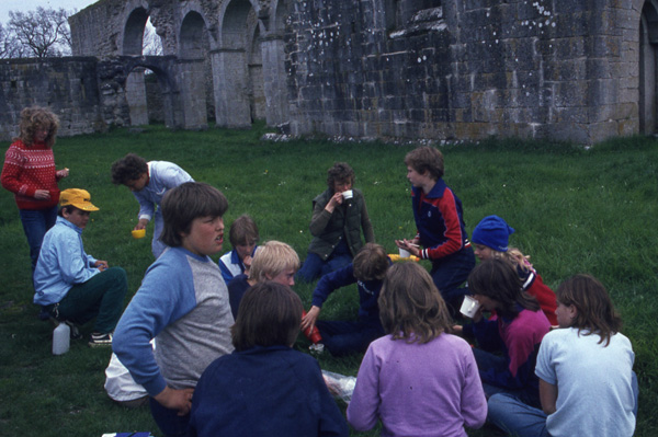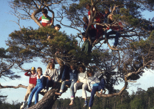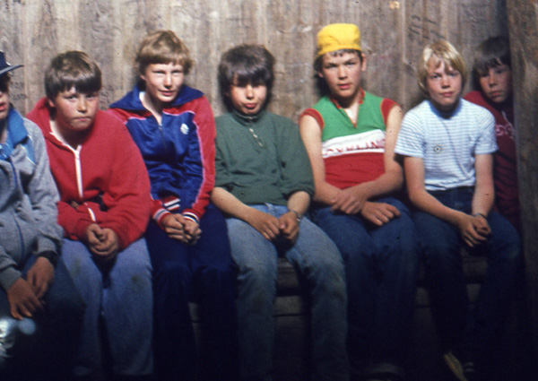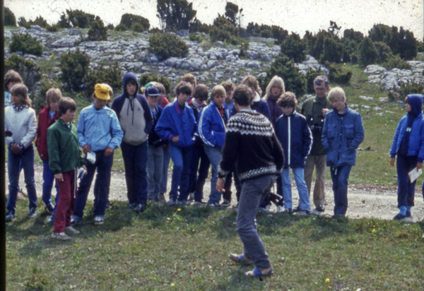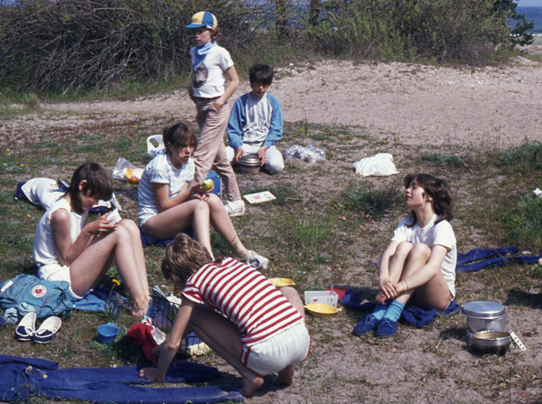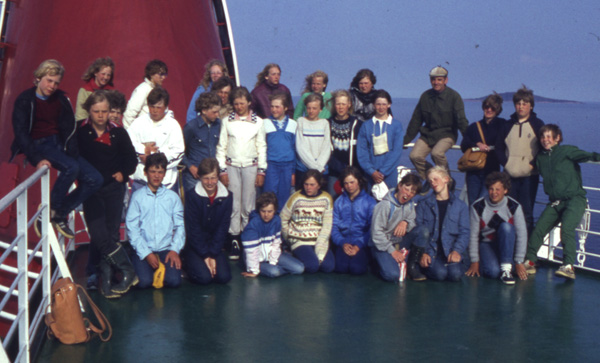 Bildtext: Barn från Lofta och Odensvi skola på klassresa med Kjell Mårtensson. Här är hela gänget på väg till Gotland. I högra delen av bilden sittande på räcket Birger Larsson lärare i Lofta. sittande på räcket på vänster sida Magnus Johansson, Morgan Hedquist, Peter Jonsson, Utrike, Lila jacka i mitten Susanne Christiansson, Gärdevi, mitten raden nr 2 från lärare Birger är Eva Olsson, nr 2 från läraren höger är Mikael Sandberg o Per Frisell. Andra namn i bakre raden; Sofia Bodger Bladh, Helena Johansson, Annelie Andersson, Elin, Råberga. Några namn i främre raden; ERik Johansson, Fårö, Ulrika Svensson, Häggdala.