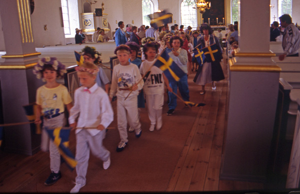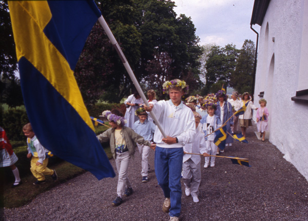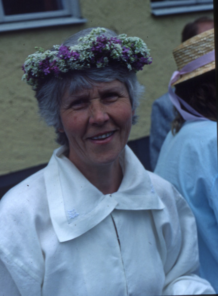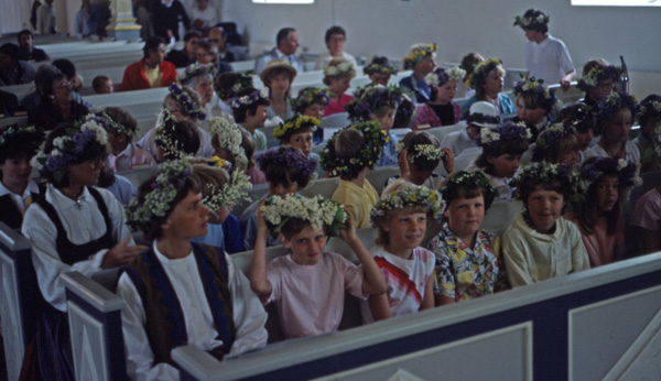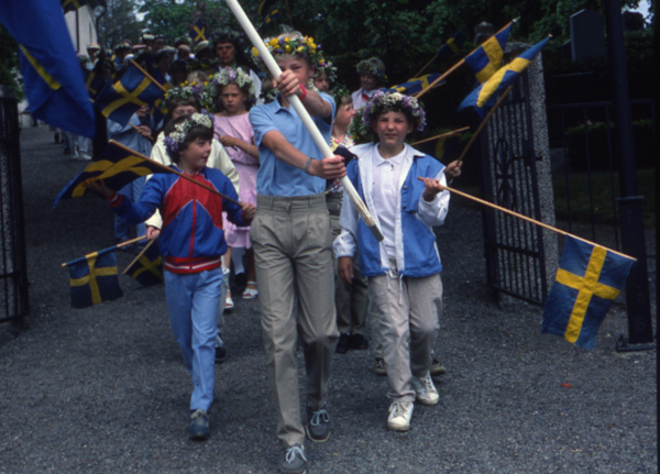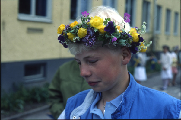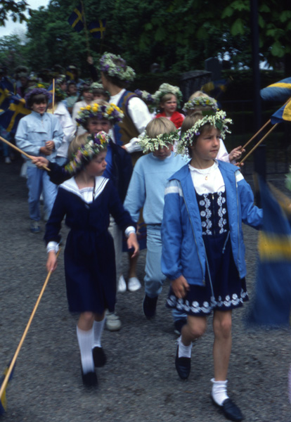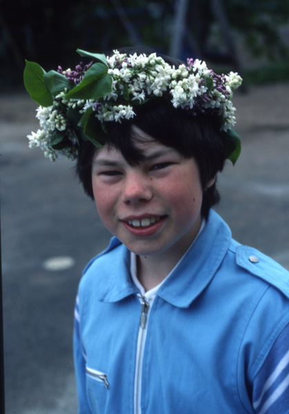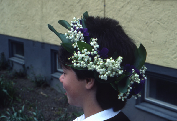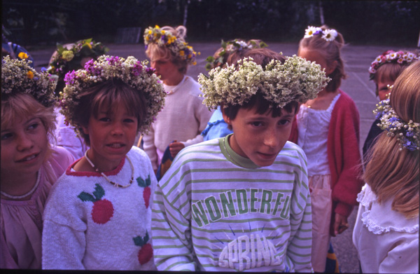 Bildtext: Skolavslutning i Odensvi skola med skolelever i blomsterkrans. Anna Lidström, Carolina Balck, Maja Zeilon, Bosse Karlsson.